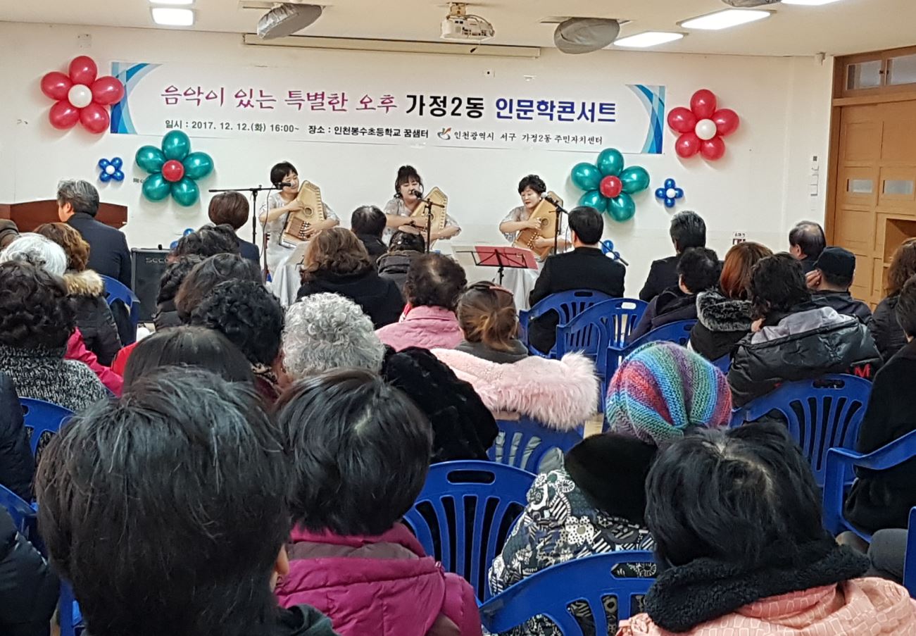 인천시 서구 가정2동 주민자치센터(위원장 이정현)는 지난 12일 인천봉수초등학교 꿈샘터에서 『음악이 있는 특별한 오후 가정2동 인문학콘서트』를 성황리에 개최했다.