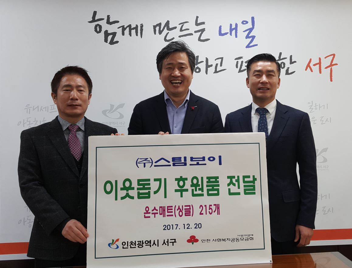 인천시 서구 건지로에 소재한 ㈜스팀보이(대표 윤정수)는 지난 20일 연말을 맞아 소외계층을 위한 온수매트(싱글, 215개)를 서구청에 기탁했다.