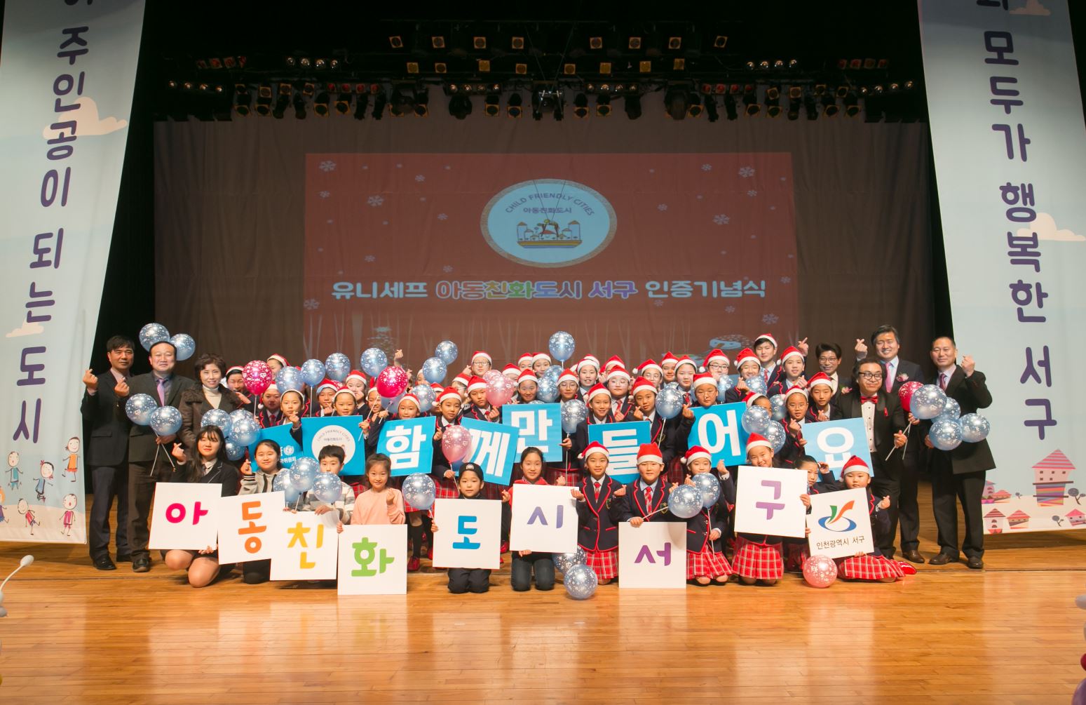 인천시 서구(구청장 강범석)는 지난 22일 서구문화회관 대공연장에서 아동과 주민 1,000여명이 참석한 가운데,「유니세프 아동친화도시 서구 인증 기념식」을 개최했다.