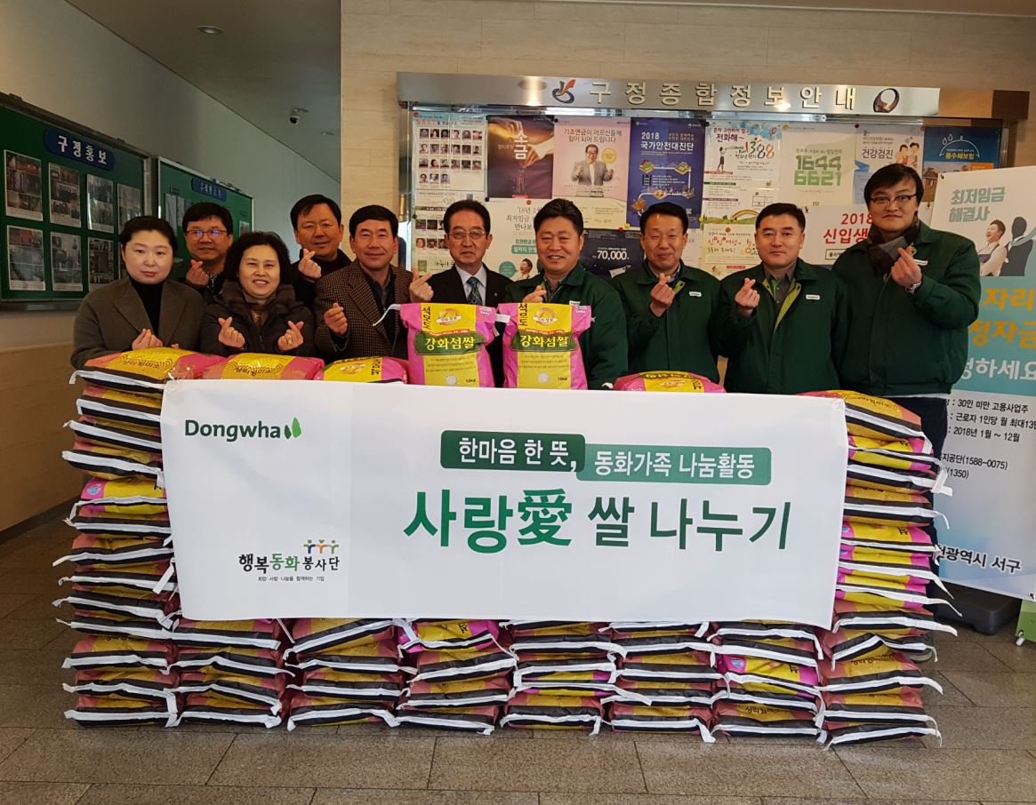 인천 서구 가좌1동에 소재한 동화기업() 소속 동화노동조합(위원장 박천기)은 설 명절을 맞아 지난 9일 지역 내 어려운 이웃을 위해 써달라며 사랑의 쌀’ 10kg 100포를 가좌1동 지역사회보장협의체에 전달했다.