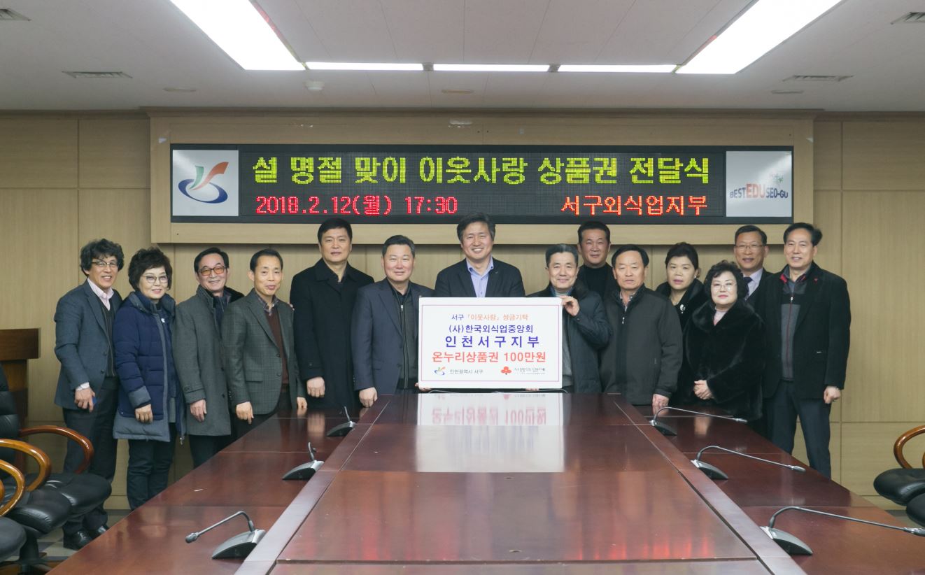 우리 고유의 명절 설을 맞이하여 (사)한국외식업중앙회 인천광역시지회 서구지부장 조귀정(희래등 대표)은 사무국장 및 운영위원들과 함께 이웃사랑 실천을 위한 성금으로 온누리상품권 일백만원을 서구청에 기탁했다.