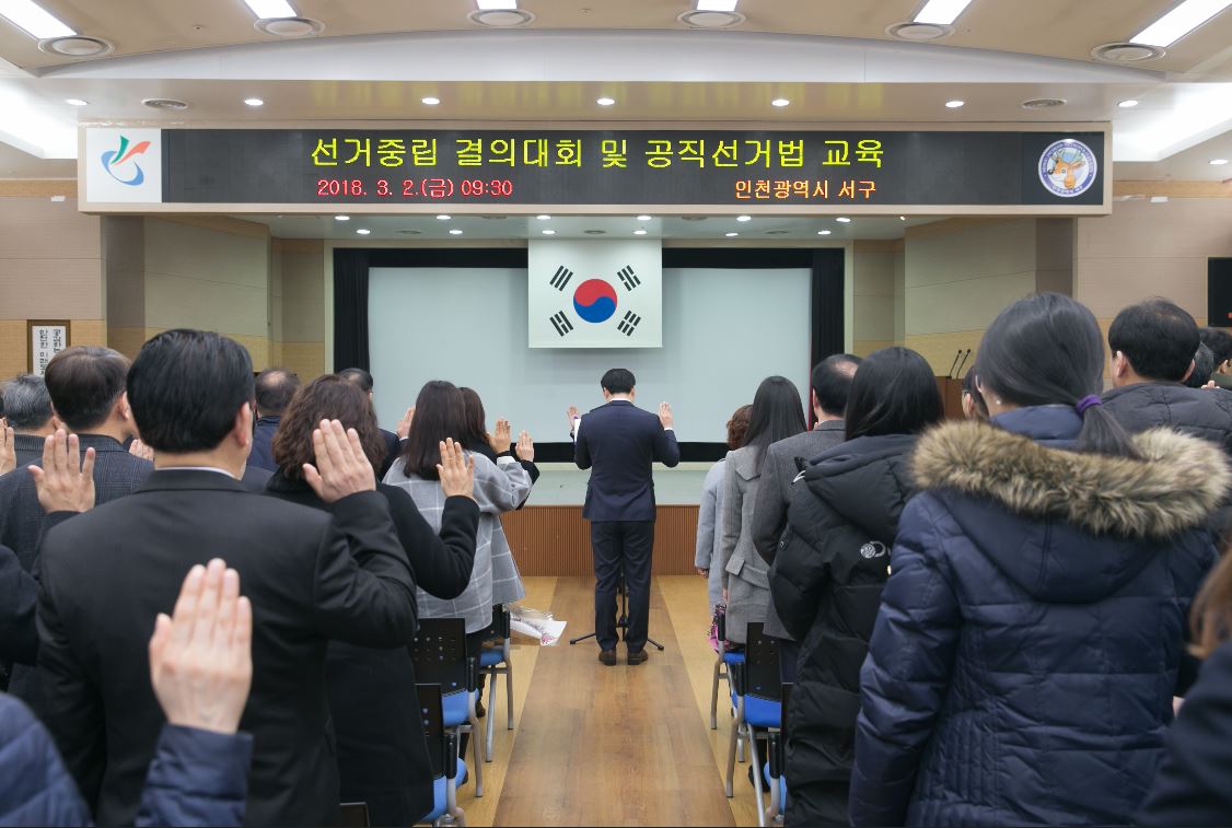 인천시 서구는 오는 6월 지방선거를 100여일 앞둔 지난 2일 구청 대회의실에서 서구청 공무원 200여명을 대상으로 선거 중립 결의대회 및 공직선거법 교육을 실시했다.