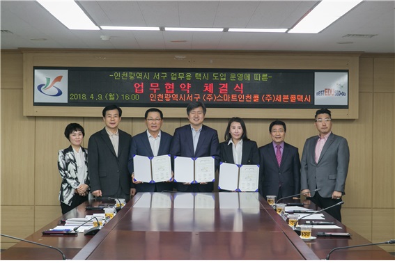 인천 서구(구청장 강범석)는 지난 9일 직원 업무편의 증진과 지역경제 활성화를 위해 업무용 택시를 도입해 운영하는 업무협약을 ㈜스마트인천콜, ㈜세븐콜택시와 체결했다.