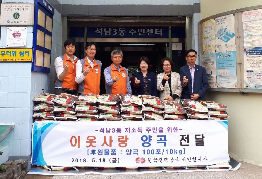 한국전력공사 서인천지사(대표 김종갑)는 지난 18일 석남3동 저소득 주민을 돕기 위해 양곡(10kg) 100포를 석남3동 행정복지센터(동장 임춘민)에 전달했다.
