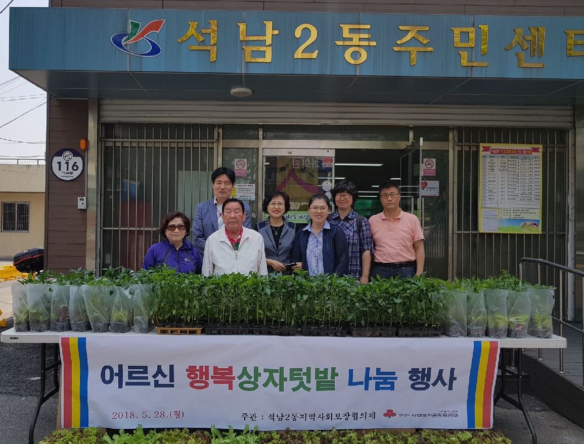 인천 서구 석남2동 지역사회보장협의체(이하‘동협의체’라 함. 동장 윤병선, 공동위원장 이형순)는, 지난 28일 관내 저소득 어르신들을 대상으로 행복상자텃밭 가꾸기 나눔행사를 열어, 이날 준비한 텃밭 작물을 관내 저소득 어르신 100여명과 경로당 5곳에 전달했다.