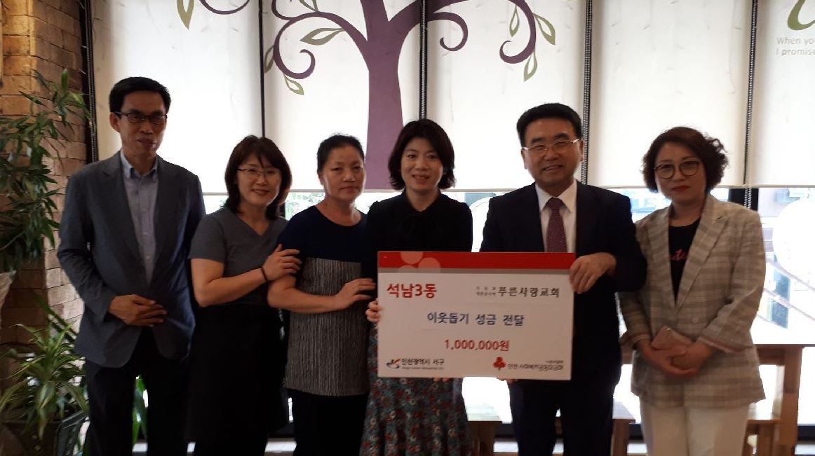 인천 서구 석남3동에 소재한 푸른사랑교회(담임목사 남근형)는 최근 이웃돕기 성금 100만원을 석남3동 지역사회보장협의체(동장 임춘민, 공동위원장 최선주)에 전달했다.