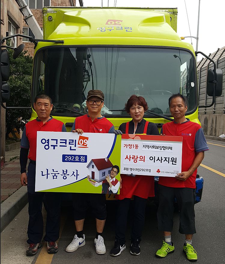 임은숙 가정1동장은 “지역 내 어려운 이웃을 위해 이사서비스를 지원해준 ㈜영구크린 인천292호점에 진심으로 감사드린다”고 말했다.