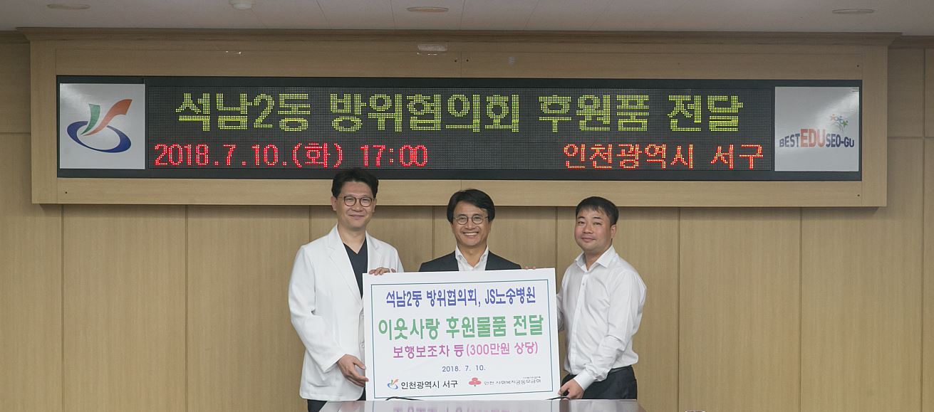 인천 서구(구청장 이재현) 석남2동 방위협의회(이하 협의회 · 회장 김일태)JS노송병원(원장 노정호·송경훈) 지난 10일 어르신용 보행보조차, 양곡, 이불과 양말 등 생활에 유용하게 사용할 수 있는 물품(300만원 상당)을 서구청에 기탁했다.