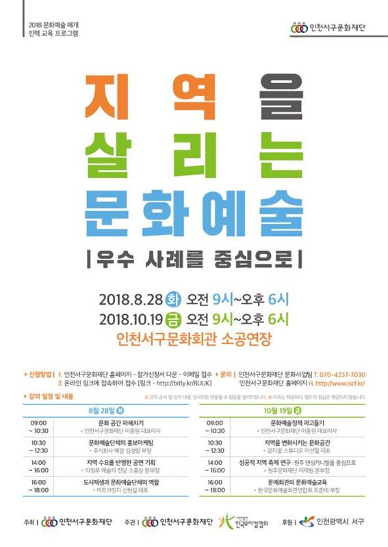 인천서구문화재단(대표 이종원)은 8월 28일과 10월 19일 2차례에 걸쳐 서구문화회관 소공연장에서 인천 내 문화예술 매개 인력들을 대상으로 한 전문 교육 프로그램을 운영한다고 밝혔다.