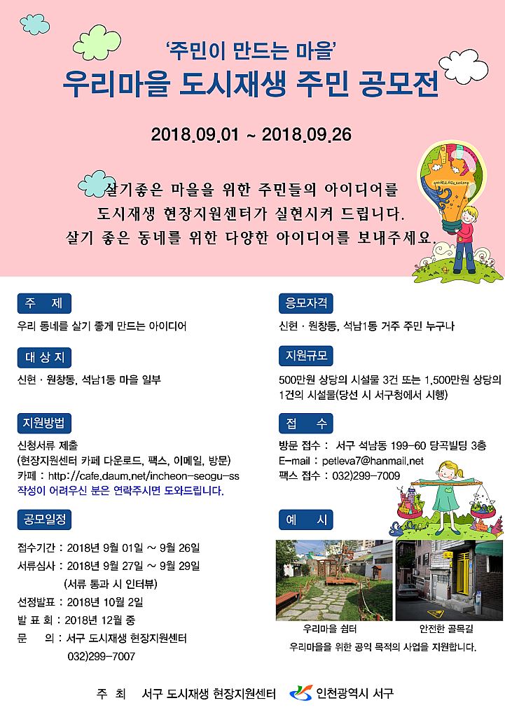 공모전에 대한 구체적인 문의 사항은 서구 도시재생현장지원센터(032-299-7007)로 문의하면 안내받을 수 있다.
