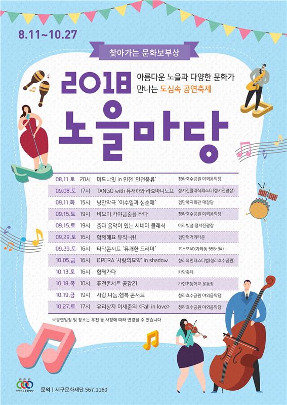 10월 5일에는 인천 자바르떼, 10월 13일에는 더원아트코리아, 10월 18일 전통타악연구소, 10월 19일에는 사랑의 하모니예술단, 10월 27일에는 유리상자 이세준밴드의 공연이 서구 내에서 예정되어 있다