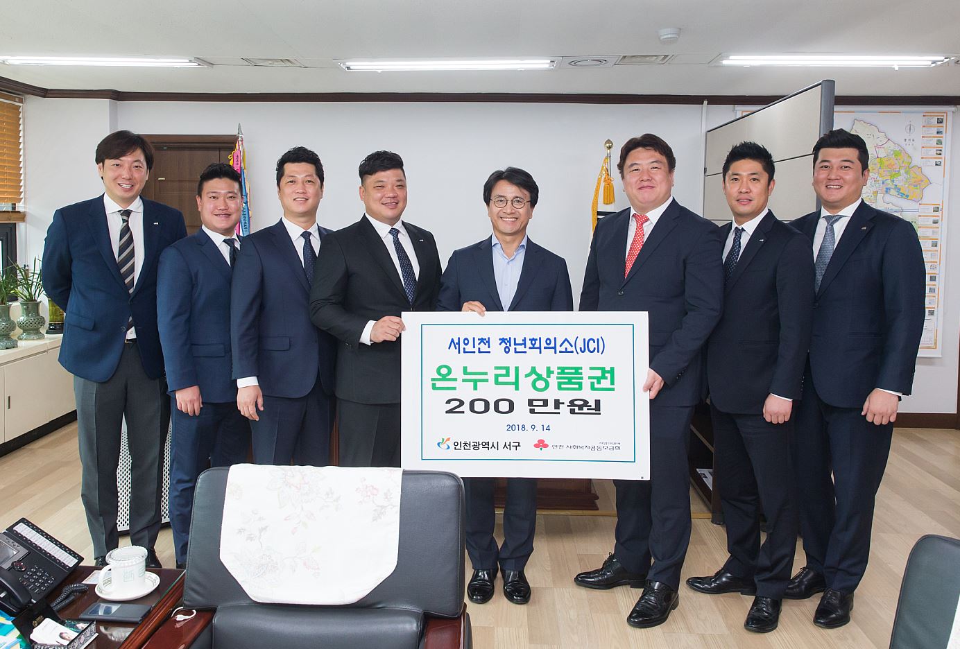 서인천 청년회의소(JCI, 회장 양영준)는 지난 14일 추석을 맞이해 이웃과 함께하기 위한 상품권 200만원을 서구청에 기탁했다.