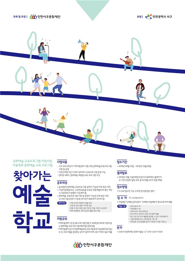 문화예술단체 공모는 10월 8일(월)까지 진행되며, 공고는 인천서구문화재단 홈페이지(http://iscf.kr)에서 확인할 수 있다. 사업자등록증 혹은 고유번호증을 가진 문화예술단체만 공모할 수 있으며, 최대 4개 프로그램까지 지원할 수 있다.
