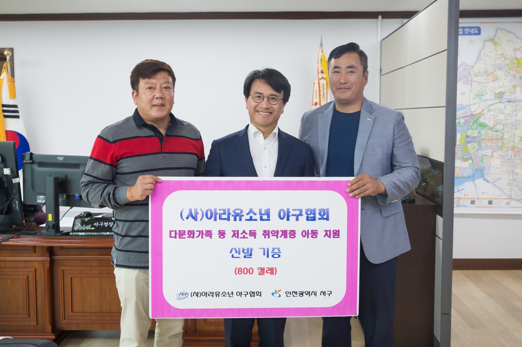 ()아라유소년 야구협회(이사장 정기영)는 지난 1일 인천 서구(구청장 이재현)를 방문해, 다문화가족 등 저소득 취약계층 아동을 위한 아동용 바퀴신발 800켤레를 기증하는 전달식을 가졌다.