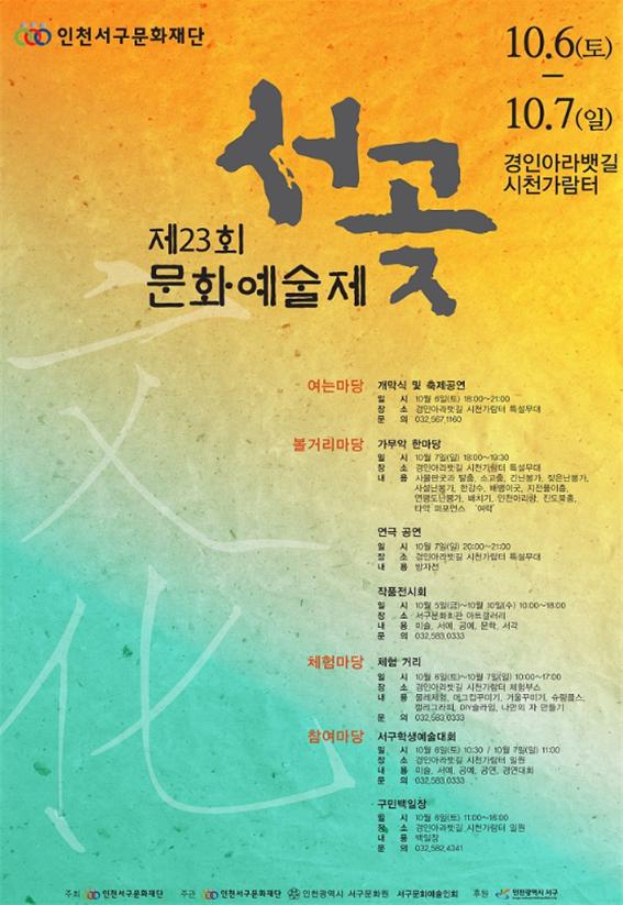 올해 23회째 맞은 서구의 대표 문화예술축제 서곶문화예술제는 서구문화재단이 서구문화예술인회, 서구문화원과 협력하여 구민과 소통하고 즐길 수 있도록 다양한 프로그램을 진행한다.