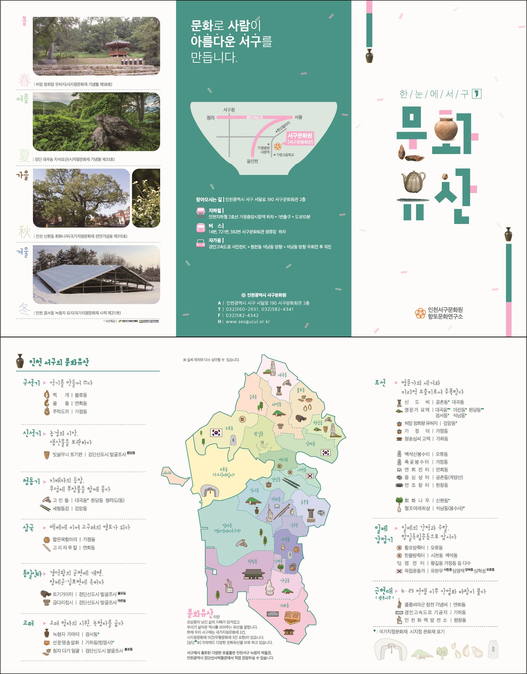 인천 서구(구청장 이재현)와 서구문화원(원장 정군섭)은 향토문화유산 발굴사업의 일환으로 ‘한눈에 서구 – 문화유산’ 리플렛을 제작해 배부한다고 밝혔다.