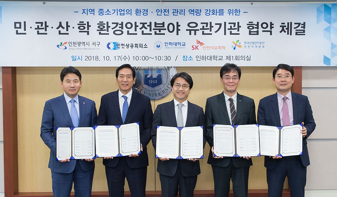 지난 17일, 인하대학교에서 인천 서구, 인하대학교, 인천상공회의소, 한국산업단지공단 인천지역본부, SK인천석유화학은‘환경∙안전 사고예방 교육 프로그램 공동개발 및 확산 추진’을 위한 업무 협약을 체결했다.