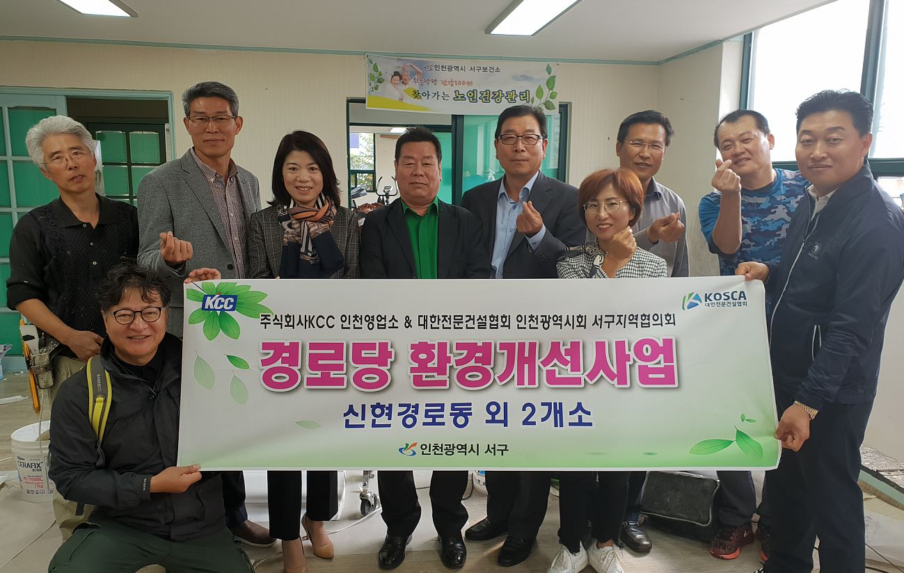 인천 서구(구청장 이재현)는 주식회사KCC 인천영업소(소장 이희근), 대한전문건설협회 인천광역시회 서구지역협의회(위원장 정연호)는 사회공헌사업의 일환으로 구립경로당 도배, 장판교체와 도색 등 환경개선사업을 실시했다.