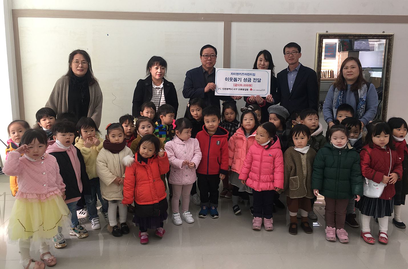 인천 서구(구청장 이재현) 오류동에 위치한 자이앤키즈어린이집(원장 이주영)에서는 지난 14일, 어린이집 원아들이 아나바다 행사를 통해 마련된 이웃돕기 성금 539,000원을 관내 어려운 이웃을 위해 사용해 달라며 오류왕길동 지역사회보장협의체(동장 최흥진, 공동위원장 손윤식)에 전달했다.