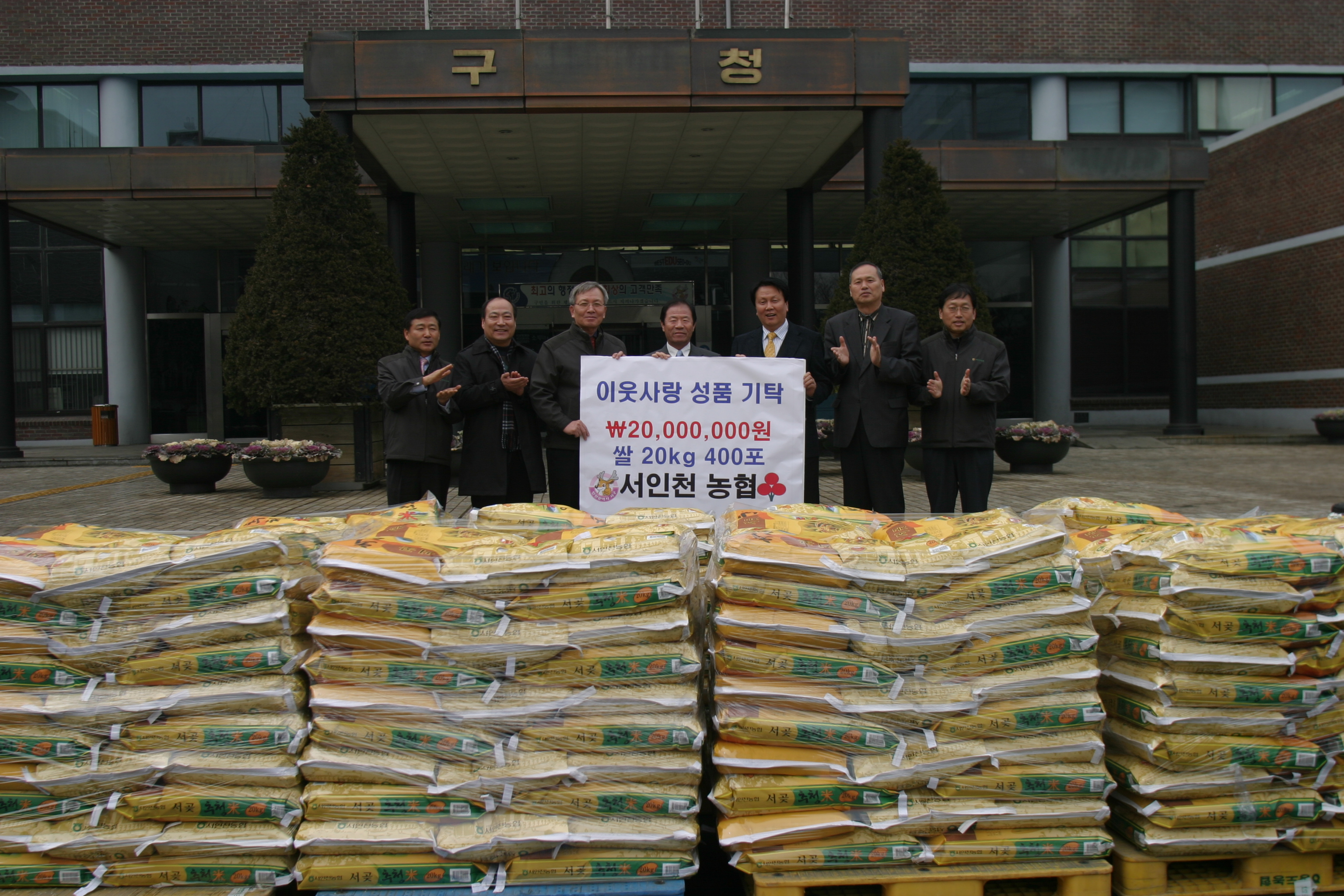 인천시 서구(청장 이훈국)에 위치한 서인천 농협(대표 이기문)은 연말연시를 맞이하여 서구 지역內 생활형편이 어려운 이웃을 위해 지난 29일 서구청에 2천만원 상당의 쌀8,000kg을 전달해 서구청 앞마당을 사랑의 쌀로 가득 채웠다.