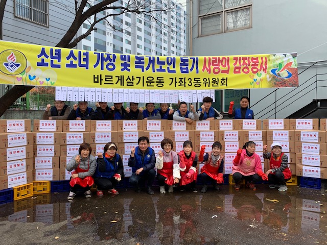 인천 서구 가좌3동 바르게살기위원회(회장 최성용)는 지난 11월 18일 가좌3동 행정복지센터(동장 이덕재)에서 독거어르신 등 관내 취약계층을 위한 사랑의 김장 나눔 봉사행사를 실시하였다고 밝혔다.