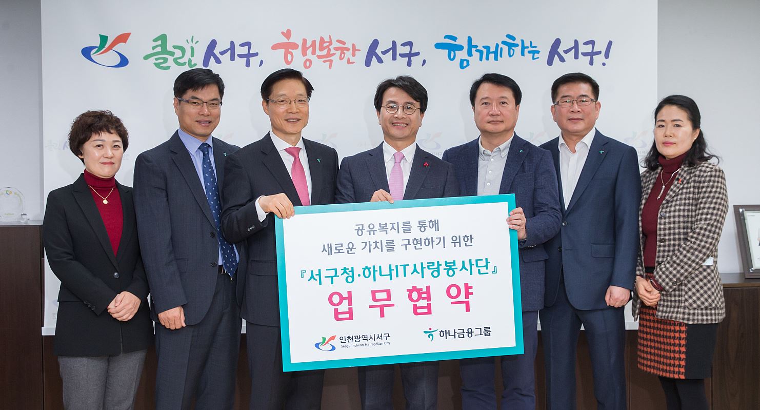 인천 서구(구청장 이재현)는 하나금융그룹 IT사랑봉사단과 사회공헌활동 추진을 위한 업무협약(MOU)을 지난 19일 체결했다고 밝혔다.
