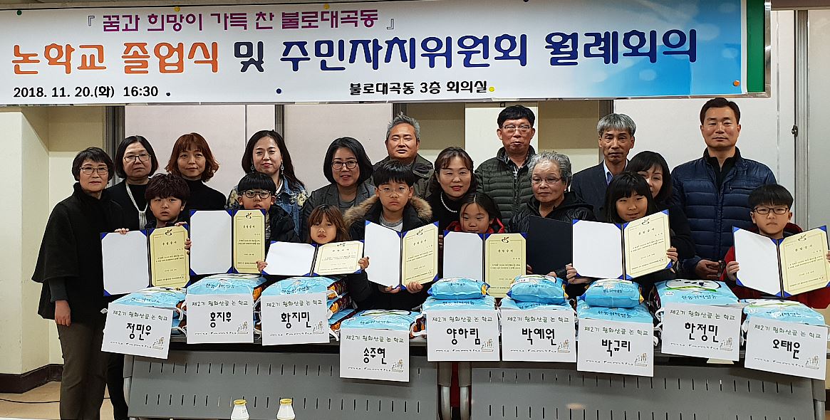 관내 9명의 초등학생들은 올해 5월 모내기부터 10월 수확까지 논농사의 과정을 손으로 직접 체험하면서 농사에 대한 지식을 얻게 된 것은 물론, 우리 농민들이 재배한 쌀을 더욱 소중하고 감사히 여길 수 있게 되었으며, 이날 불로대곡동 주민자치위원들의 축하와 격려 속에 쌀과 졸업증서를 받으며 논학교 활동을 마무리했다.