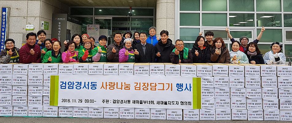 인천 서구(구청장 이재현) 검암경서동 새마을부녀회(회장 정모란)와 새마을지도자협의회(회장 이기학)는 지난 28일과 29일 이틀에 걸쳐 검암경서동행정복지센터 앞마당에서 ‘사랑 나눔 김장 행사’를 개최했다.