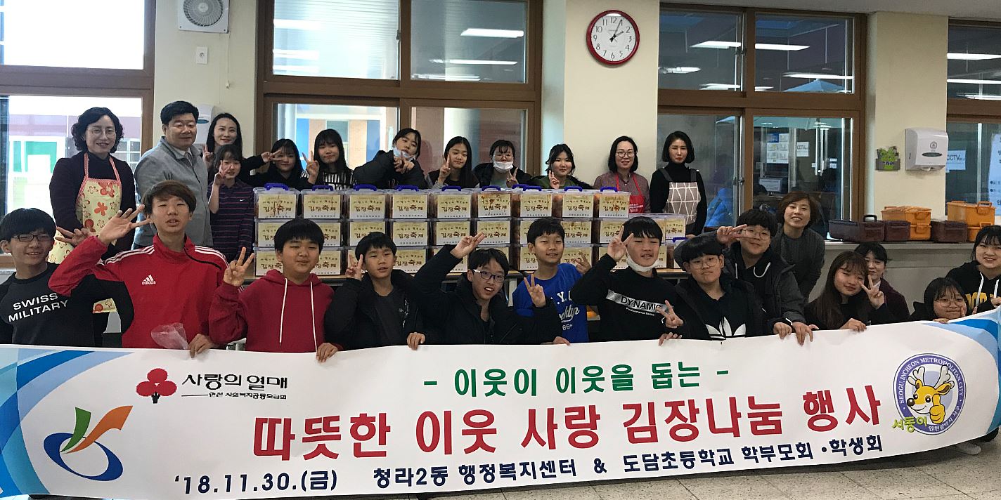 차가운 날씨에도 아랑곳하지 않고 즐거운 마음으로 학부모회 소속 20여명의 어머니들과 도담초 6학년 학생 전원이 참석해, 직접 버무린 김장김치는 이웃 사랑의 마음과 정성을 듬뿍 담은만큼 그 의미가 더 컸다.
