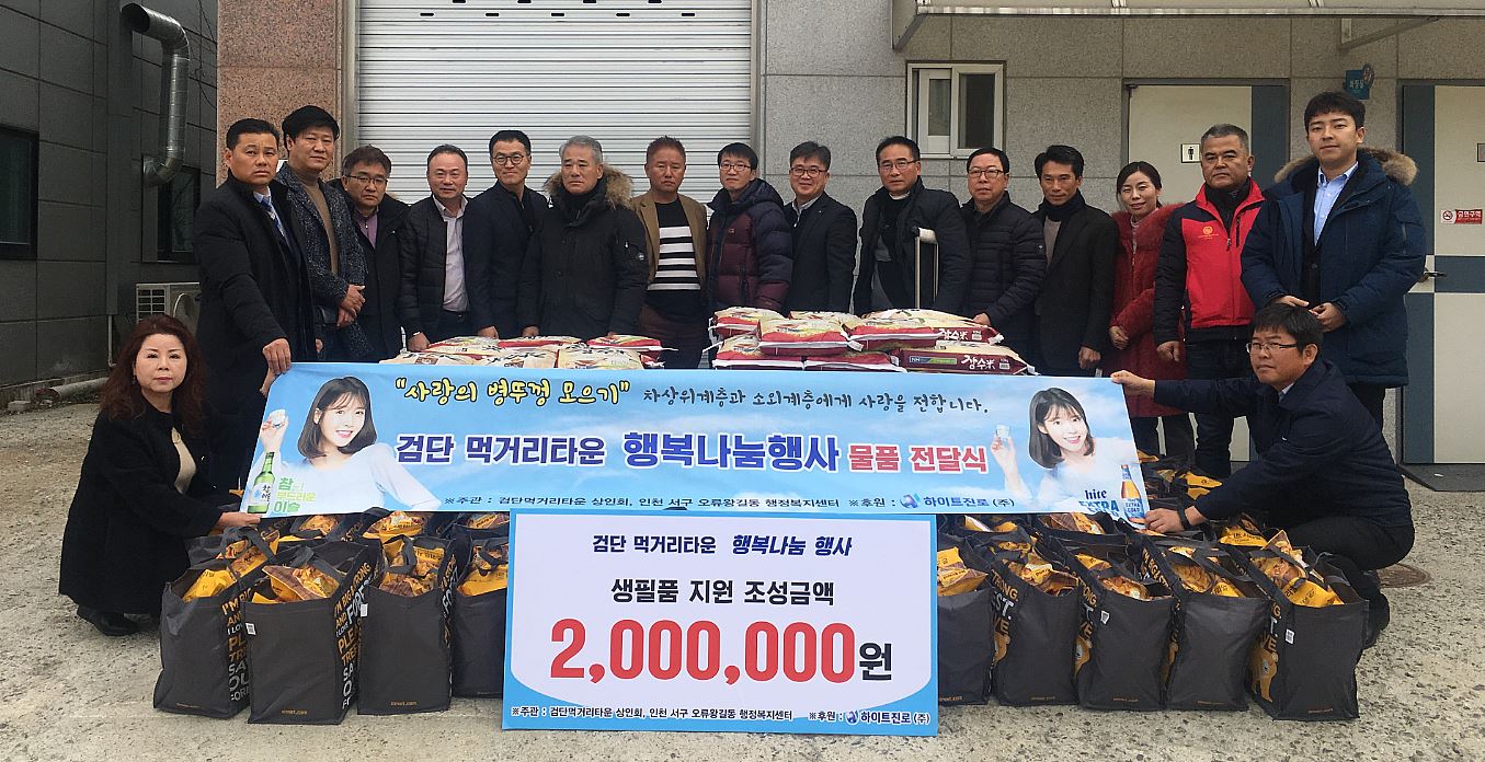 인천 서구(구청장 이재현) 검단먹거리타운 상인회(회장 최진구)와 하이트진로(주)특판 경기서부지점(지점장 이민호)은 지난 5일, 오류왕길동과 업무협약을 통해 맺어진 ‘행복나눔행사’ 캠페인을 통해 마련한 생필품 꾸러미를 오류왕길동행정복지센터(동장 최흥진)에 전달했다.