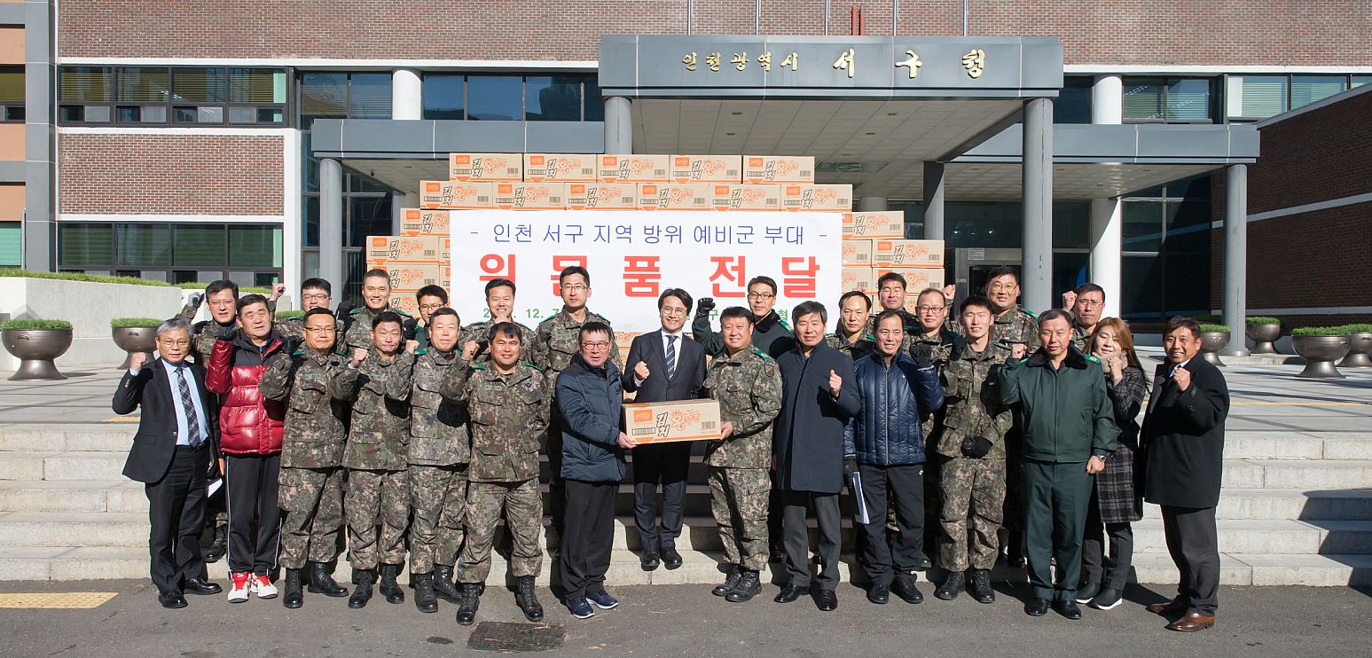 인천서구통합방위협의회(의장 이재현 서구청장)는 지난 7일 서구청 본관에서 이재현 서구청장, 김원배 회장, 통합방위협의회 위원 5명을 비롯한 관내 예비군 동대장 등 30여명이 참여한 가운데 예비군 부대(동대)에서 근무하고 있는 장병들을 격려하기 위한 위문품(200만원 상당의 생필품 및 운동용품) 전달식을 가졌다.