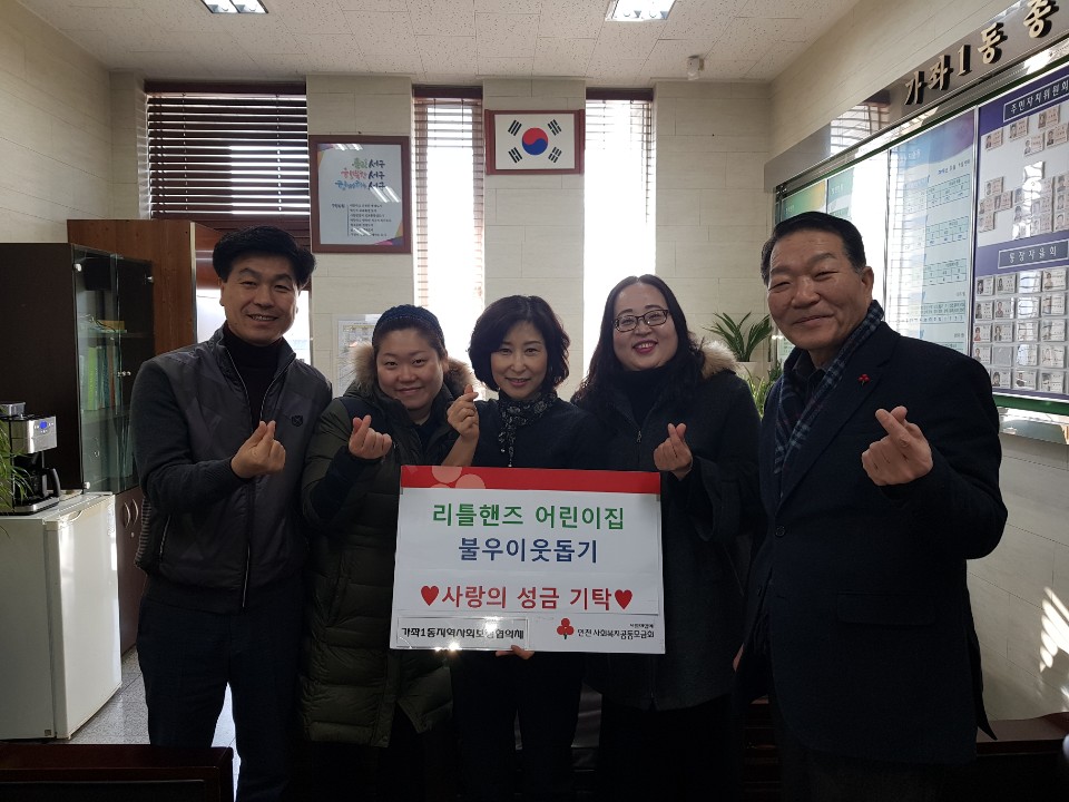 인천 서구 가좌1동 리틀핸즈 어린이집 한유남 원장은 26일 지역내 어려운 이웃을 위해 써달라며 이웃돕기 ‘사랑의 성금’ 500,000원을 가좌1동 지역사회보장협의체(공동위원장 윤명훈, 이지학)에 전달하였다.