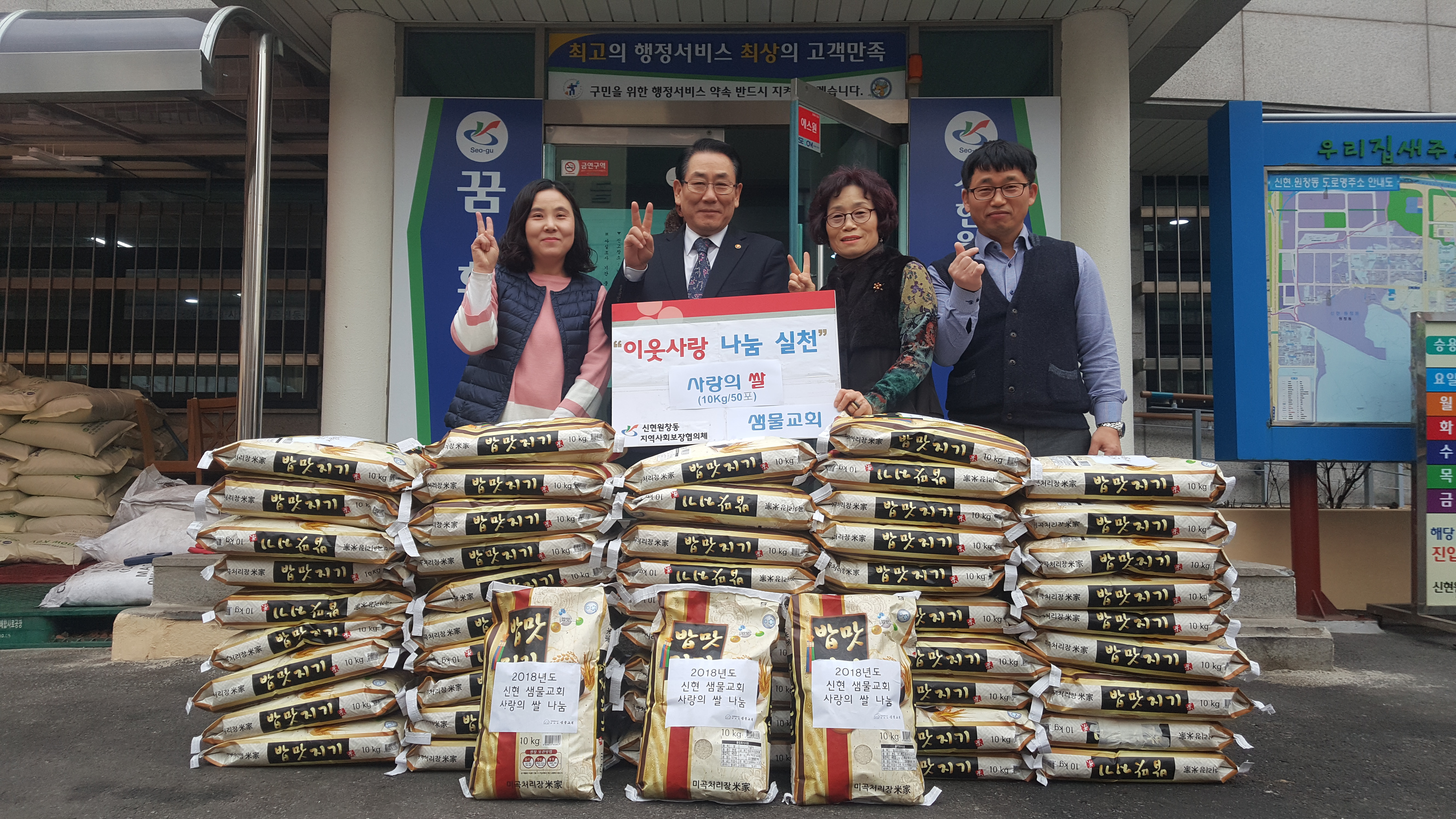 샘물교회는 매년 서구 소외계층에게 사랑의 쌀을 후원하고 있으며 올해는 소재지인 신현원창동 지역주민에게 직접적인 도움을 주고자 사랑의 쌀을 후원하게 되었다. 앞으로도 지속적으로 신현원창동 지역주민에게 사랑의 쌀을 후원할 예정이라고 하였다.