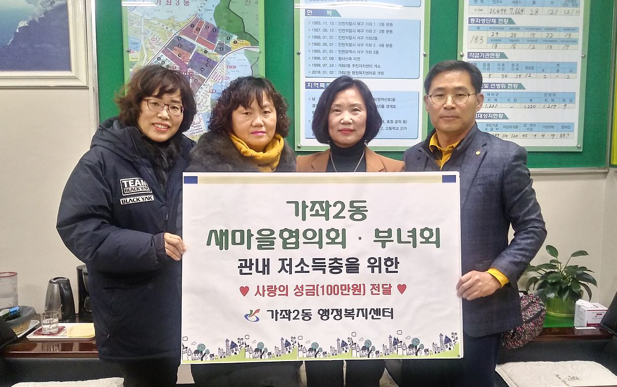 인천 서구(구청장 이재현) 가좌2동 새마을협의회(회장 김영필)와 새마을부녀회(회장 박현녀)에서는 가좌2동사회보장협의체에 이웃돕기 성금 1백만원을 전달했다. 기탁된 성금은 인천사회복지공동모금회를 통해 관내 취약계층에게 지원될 예정이다.