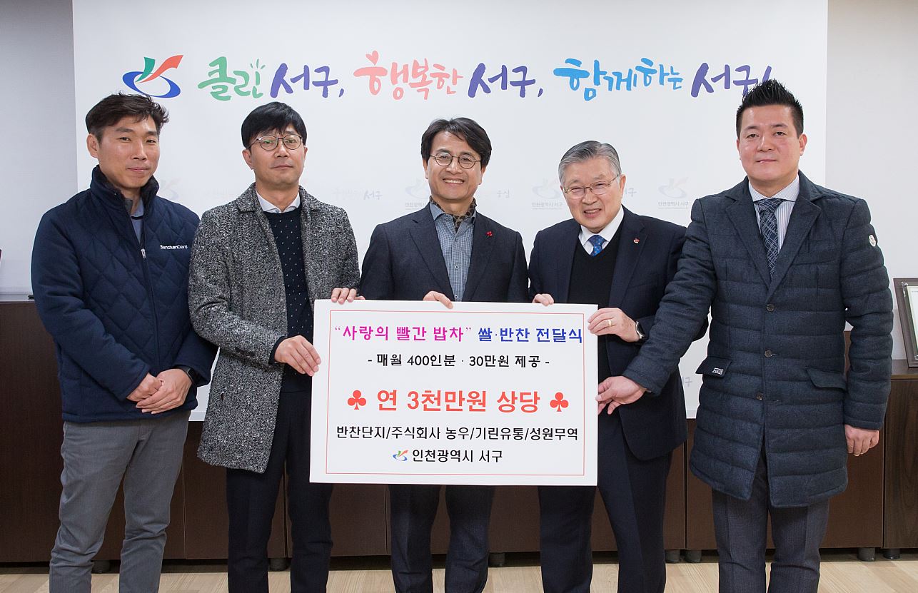 인천서구식품제조업체인 반찬단지(대표 우성명)와 주식회사 농우(대표 전제희)는 유통업체인 기린유통 및 성원무역과 함께 지난 11일, 서구청에 매월 쌀․반찬 400인분과 기자재 구입비용 30만원을 기부하는 전달식을 가졌다.