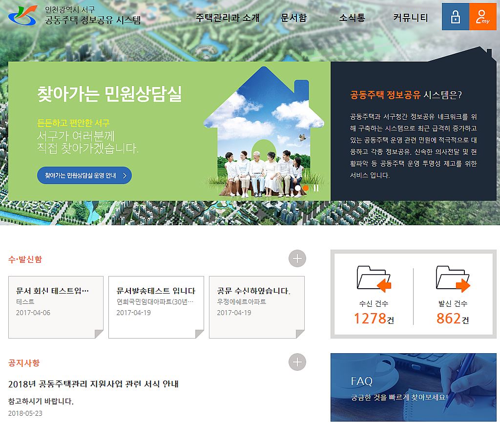 공동주택 정보공유시스템(이하 시스템)은 인천 서구가 전국 최초로 관내 아파트 관리주체와 모든 공문서를 수·발신하고 각종 보고자료 작성·제출 및 홍보·안내자료 송부 등 구청과 관리주체 간 피드백이 가능하도록 네트워크를 구축한 것이다.