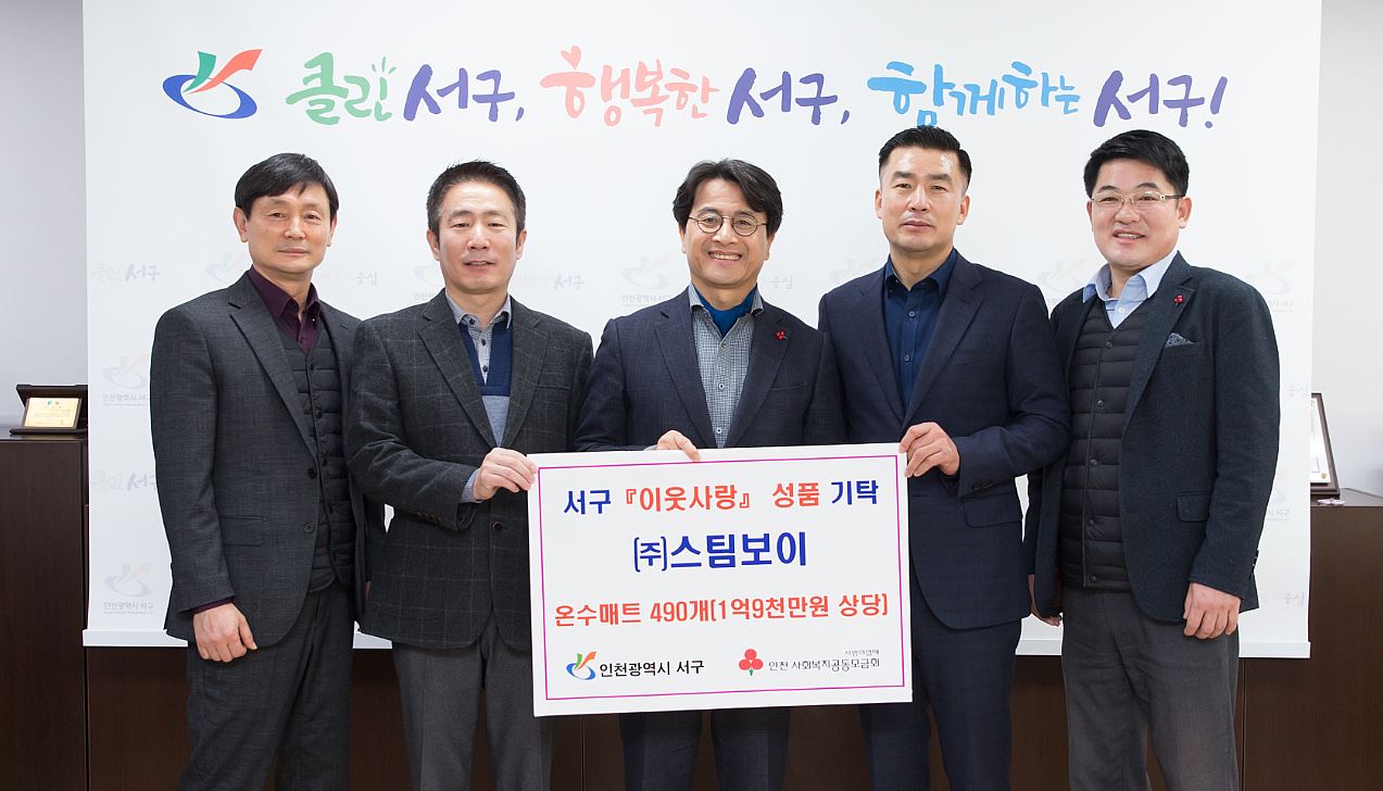 인천 서구(구청장 이재현) 건지로에 소재한 ㈜스팀보이(대표 윤정수)는 지난 17일 독거노인 등 소외계층을 위한 온수매트 490개(판매가 기준 1억 9천만 원 상당)를 구에 기탁했다.