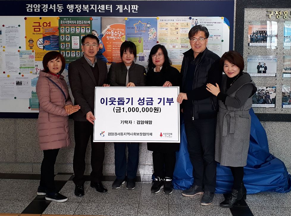 인천 서구(구청장 이재현) 검암·경서동 지역 커뮤니티 카페인 검암愛맘에서 지난 28일, 이웃돕기 성금 100만원을 검암경서동지역사회보장협의체(공동위원장 김창수, 황용인)에 기탁했다.