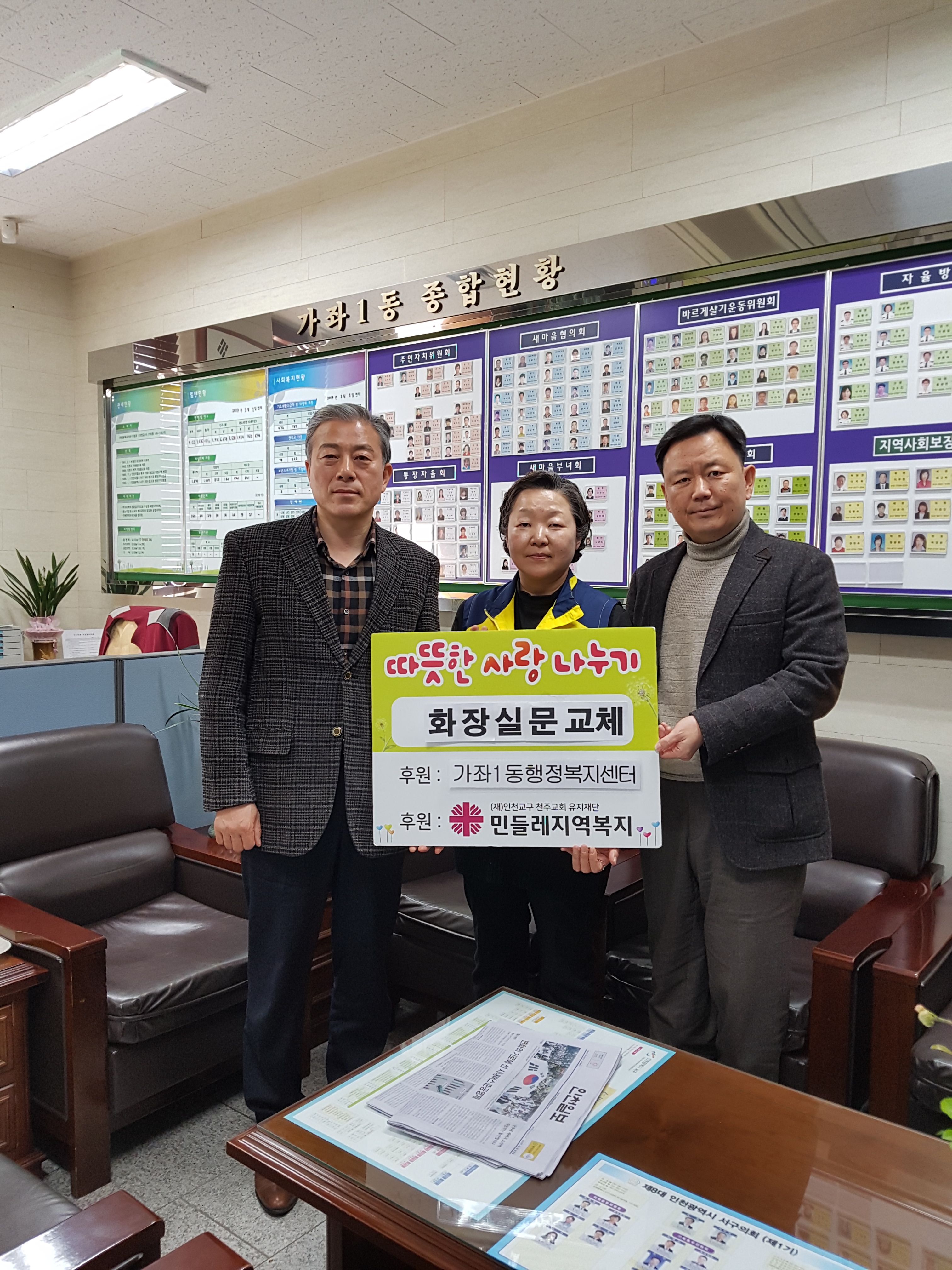 천주교 인천교구 민들레지역복지(대표 장준혁 신부)는 지난 2월 26일, 가좌1동 행정복지센터(동장 장광택)의 협조요청을 통해 주거환경이 열악한 사례관리대상자 가정에 화장실 문짝 설치를 지원하였다.