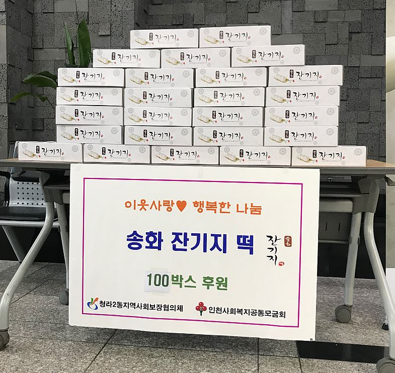 인천 서구 청라2동에 소재한 잔기지떡 청라점(대표 박민수)은 개업 1주년을 맞아 이웃사랑을 실천하기 위해 판매하고 있는 떡 100박스를 청라2동 지역사회보장협의체(공동위원장 전성택, 박병열)에 전달했다.