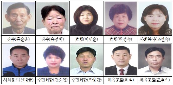 이번 주민상은 장수, 효행, 사회봉사, 체육공로, 주민화합, 친절봉사부문 등 6개 분야에 대해 후보자를 추천받아 주민상 심의위원회의 심의를 거쳐 수상자를 선정했다.