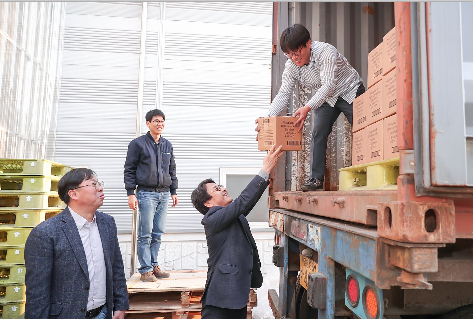 사진2 설명 : 해외 판로개척 지원 사업에 참여, 계약을 성사한 ㈜에코매스에서 이재현 서구청장이 스웨덴에 수출할 물품을 싣고 있다.