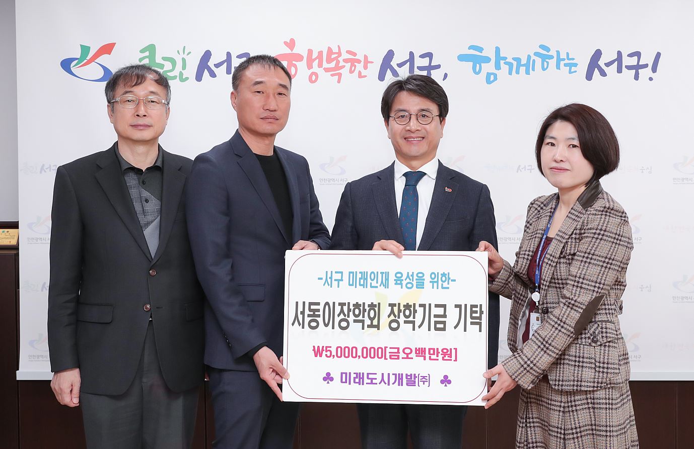 이재현 서구청장은 “지역인재 양성에 뜻을 모아준 미래도시개발(주)김연옥 대표에게 감사드리며, 이번 장학금 기탁을 계기로 지역 사회에 성숙한 기부 문화가 확산되고 우리학생들의 꿈과 재능은 한 뼘 더 자랄 것”이라고 밝혔다.