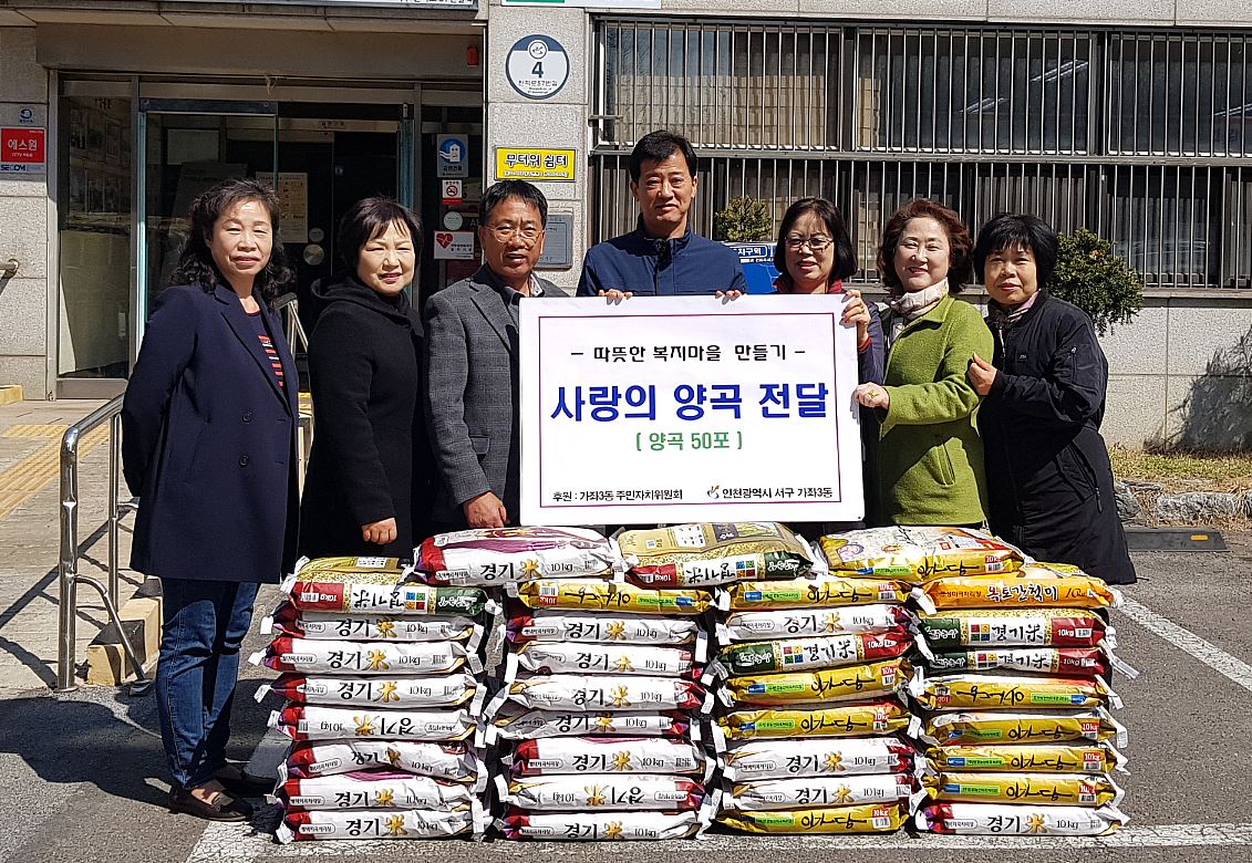 인천 서구 가좌3동 주민자치위원회(위원장 이선순)는 지난 2일 가좌3동 행정복지센터(동장 박충기)에 이웃돕기 양곡(10kg, 50포)을 전달했다.