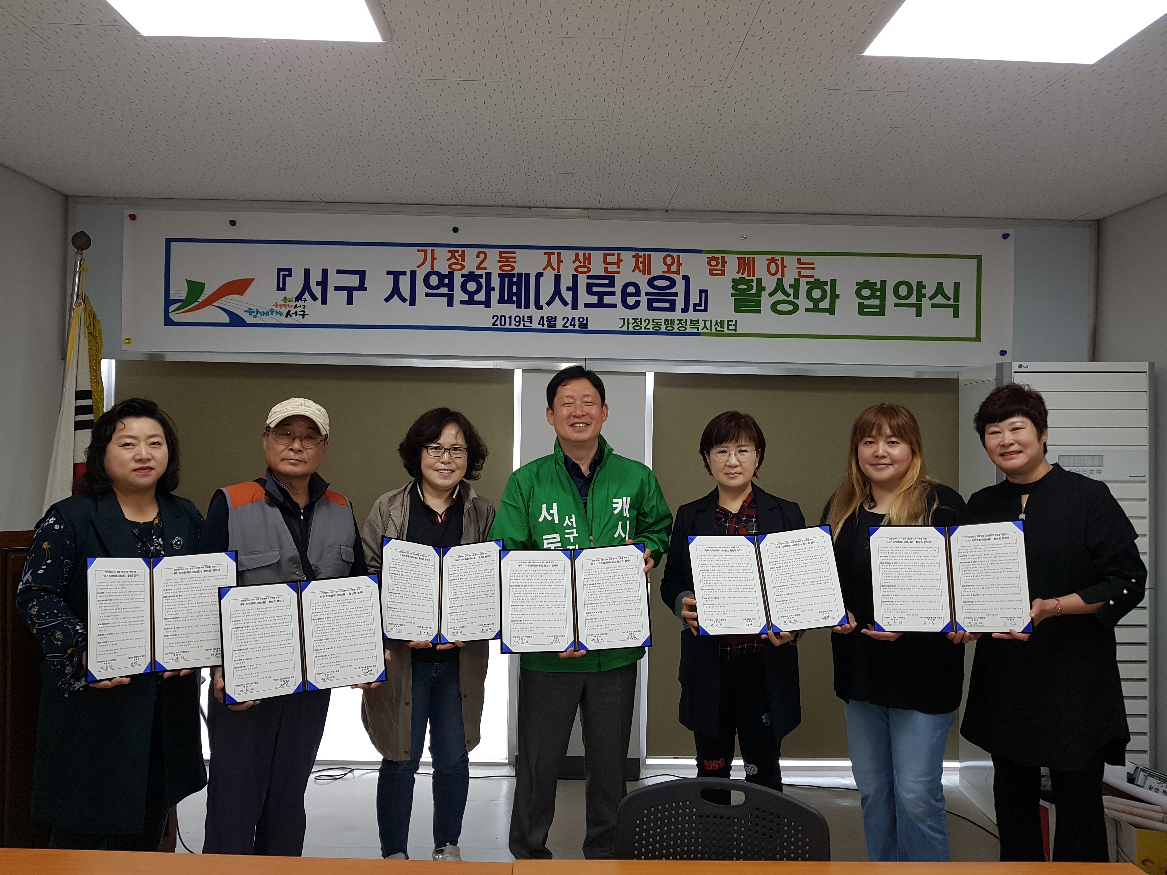 이번 협약은 지역경제 활성화 및 지역공동체강화를 목적으로 서구 지역 내에서 경제가 순환할 수 있는 경제체계 구축에 기여하고자 마련되었으며, 가정2동에서는 서로e음 활성화 및 홍보활동을 적극 지원하고, 자생단체원들은 “1인 1 서로e음 갖기 운동”을 추진하는 등 서로e음이 조기에 활성화 될 수 있도록 구민 주도 홍보체계 마련을 위해 함께 노력하기로 하였다.