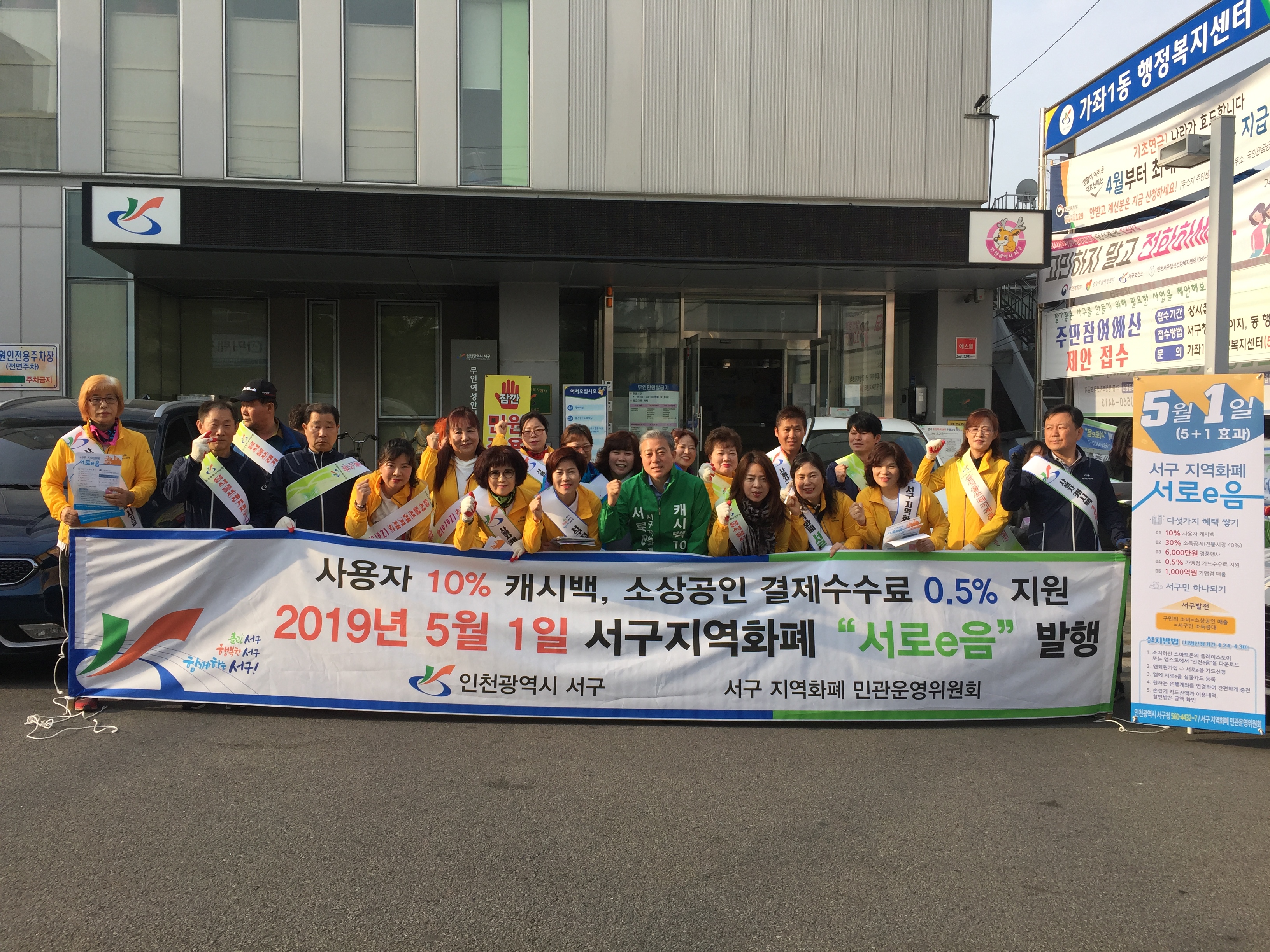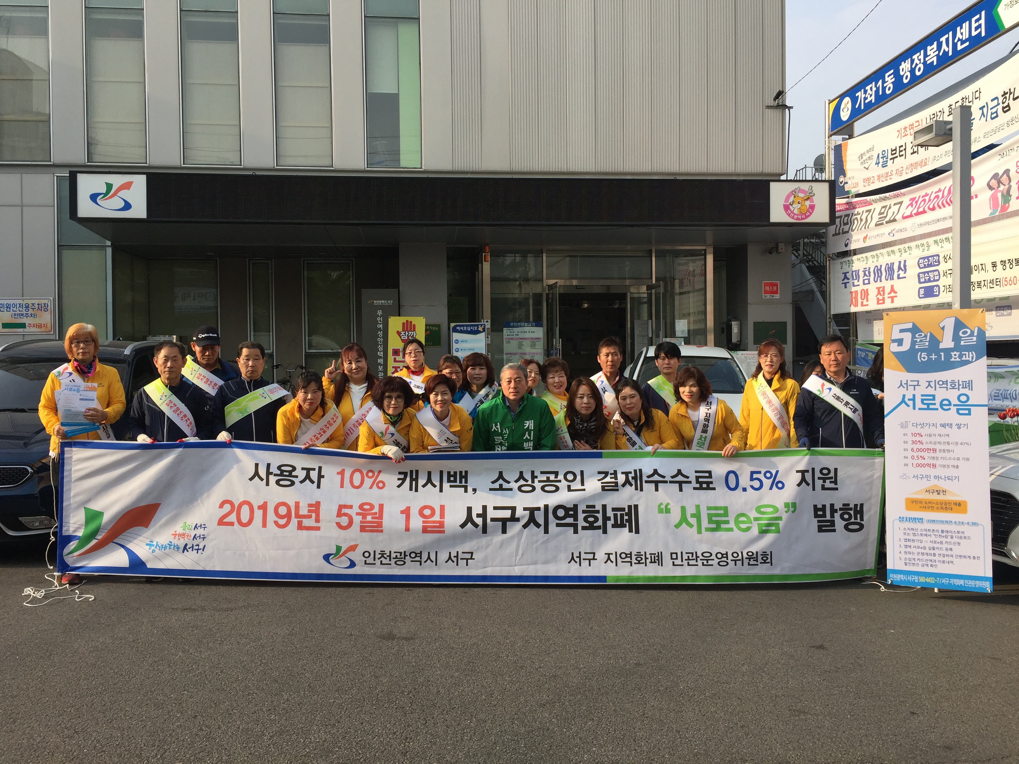인천광역시 서구 가좌1동(동장 장광택)은 지난 4월 23일 통장자율회(회장 최규옥) 회원들과 함께 서구 지역화폐 서로e음 홍보 캠페인을 전개하였다.