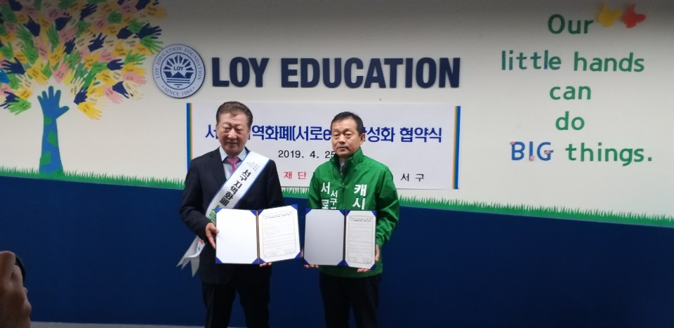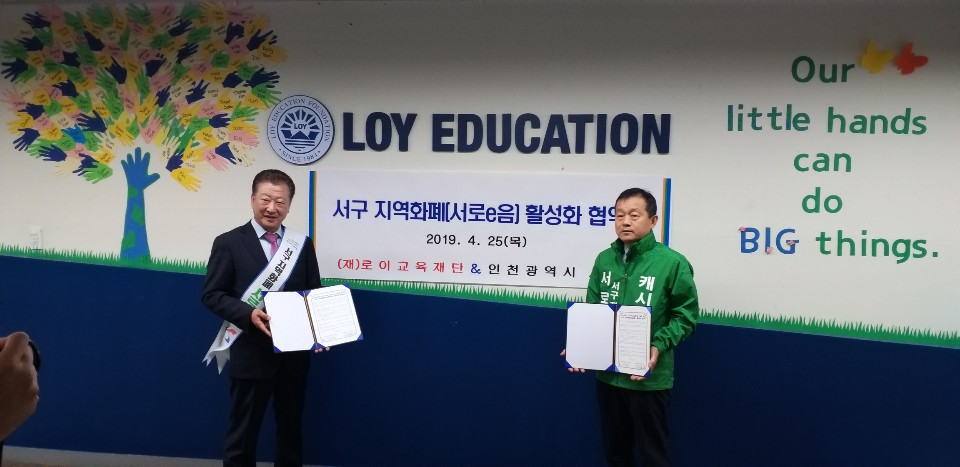 인천광역시 서구는 지난 4월 25일 (재)로이교육재단(이사장 이우영)과 서구 지역화폐 서로e음(이하 “서로e음”이라 한다) 활성화를 위한 협약을 체결하였다.