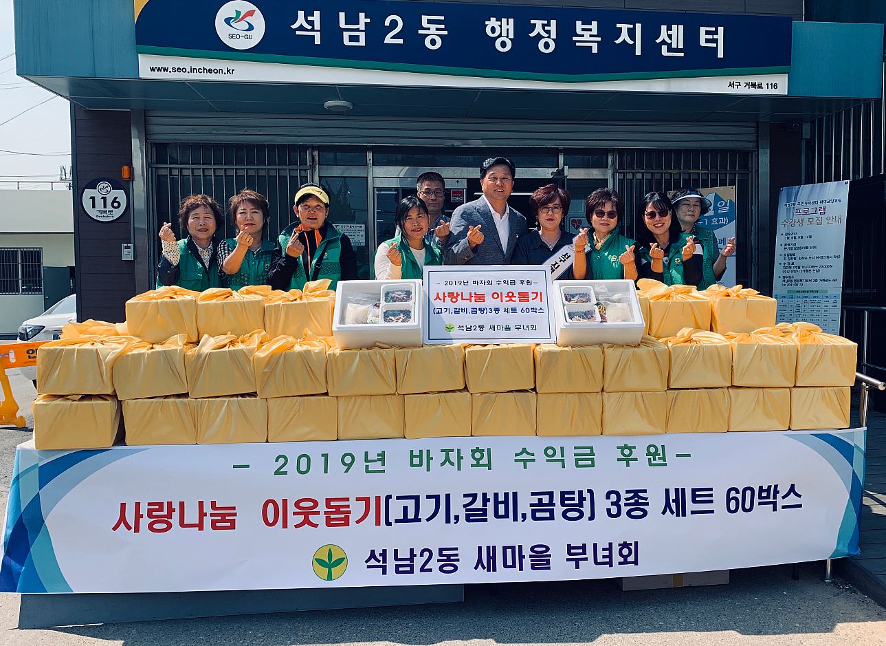 인천 서구 석남2동새마을부녀회(회장 이영숙)는 지난 9, 이웃돕기 물품 고기·갈비·곰탕 3종 세트 60박스를 석남2동행정복지센터에 기증했다. 이날 기증된 고기·갈비·곰탕 3종 세트 60박스는 지난 새마을부녀회 이웃돕기 바자회 수익금으로 마련됐으며 관내 취약계층에 고루 전달됐다.