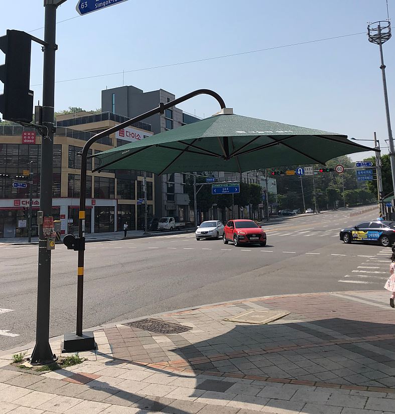 교통신호를 기다리며 뜨거운 자외선을 잠시나마 피할 수 있는 그늘막은 학교 앞 횡단보도, 유동인구가 많은 사거리 횡단보도 등 54개소를 추가로 설치해, 구가 운영 중인 폭염쉼터 그늘막은 총 160개소이다.