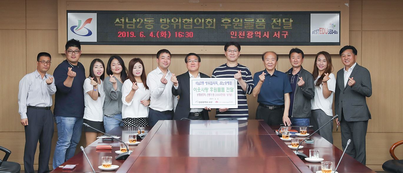 인천 서구 석남2동방위협의회(회장 김일태)와 JS노송병원(원장 노정호)는 지난 4일 거동불편 어르신과 저소득 가정을 위해 보행보조차, 선풍기, 양말세트 등 300만원 상당의 후원물품을 서구청에 기탁했다.